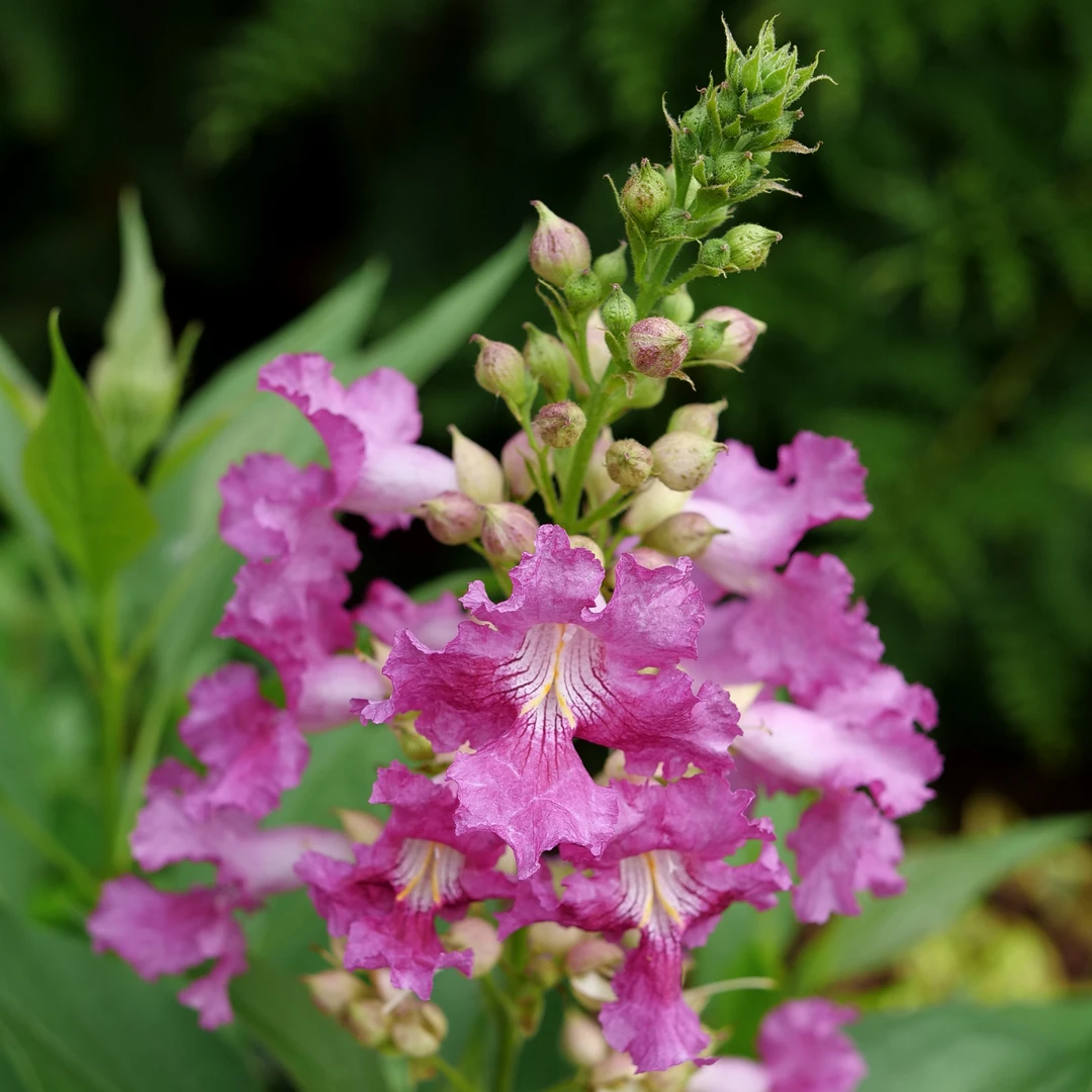 - Intricate pink/purple flowers resemble orchids.
