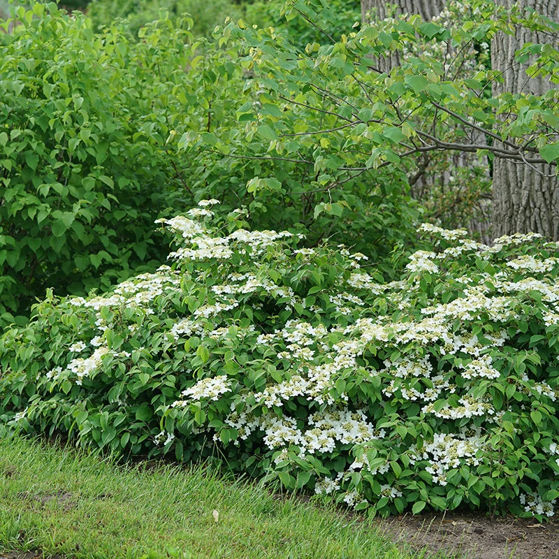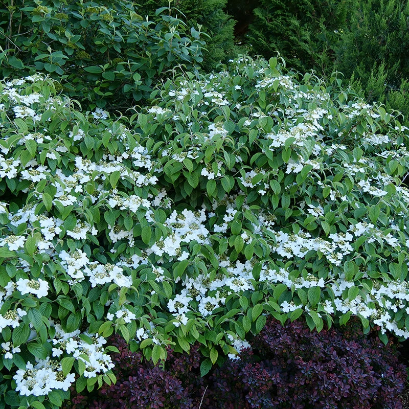 - Large white lace-cap flowers cover the shrub in spring.